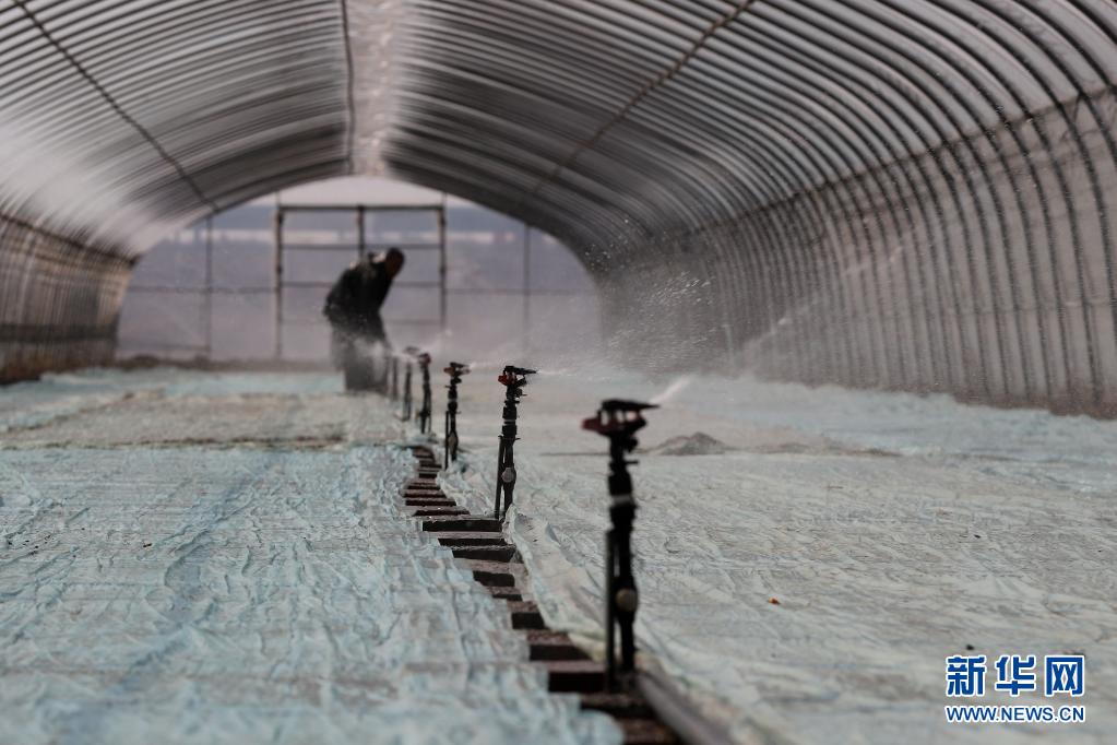 4月6日,河北省唐山市海港經濟開發區水稻種植合作社的社員在育秧棚內給秧盤澆水。