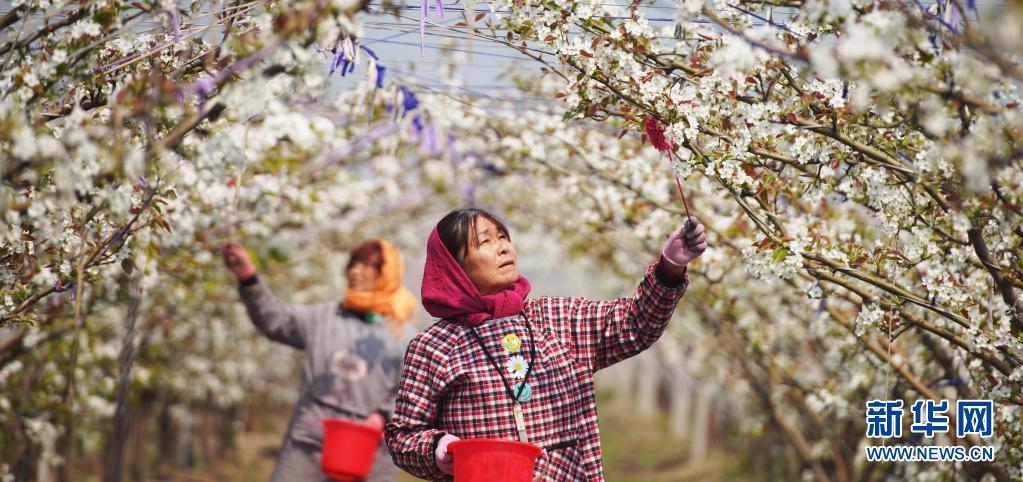4月6日,山東濱州鄒平市長山鎮八方農場的果農在給梨花授粉。