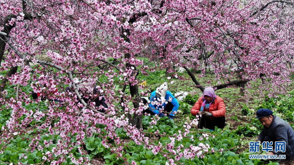 4月6日,甘肅省隴南市宕昌縣城關鎮玉地河村群眾在桃樹下采挖小白菜。