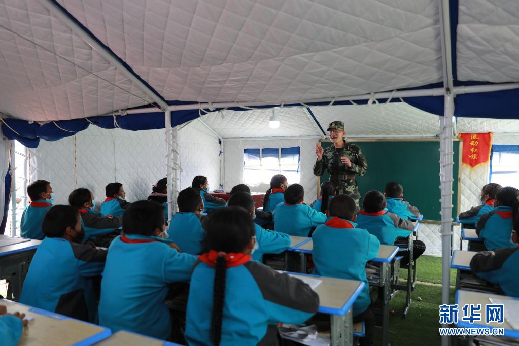 5月24日,武警青??傟牴逯ш牂C動大隊排長張國睿為花石峽鎮藏文中心寄宿制小學的孩子上課。新華社記者 劉新 攝