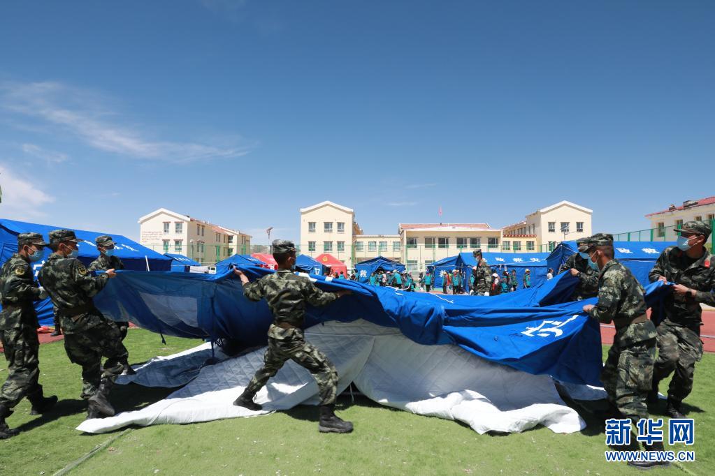 5月24日,武警青海總隊果洛支隊機動大隊官兵為花石峽鎮藏文中心寄宿制小學搭建帳篷教室。新華社記者 劉芳 攝