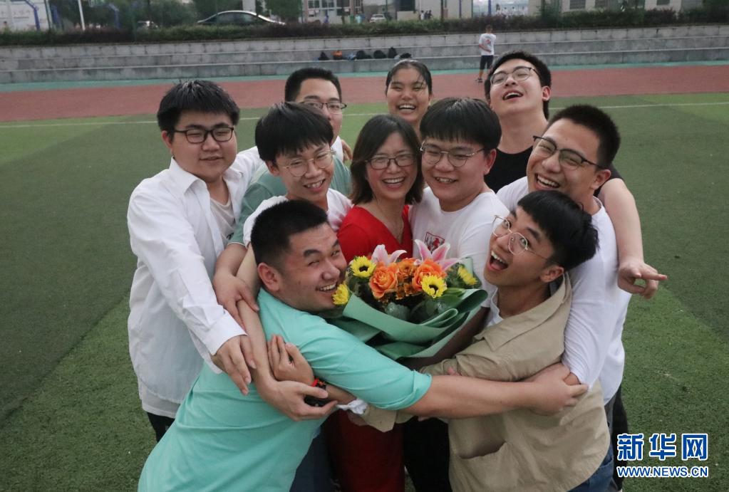 6月9日,在湖南省婁底市第四中學,完成高考的老三李慶民(中排右二)和老師同學們在一起。