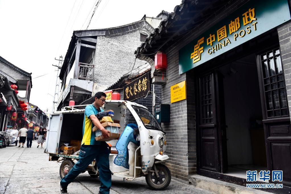 6月20日,在微山縣南陽鎮(zhèn),郵遞員王少朋在搬卸郵件。