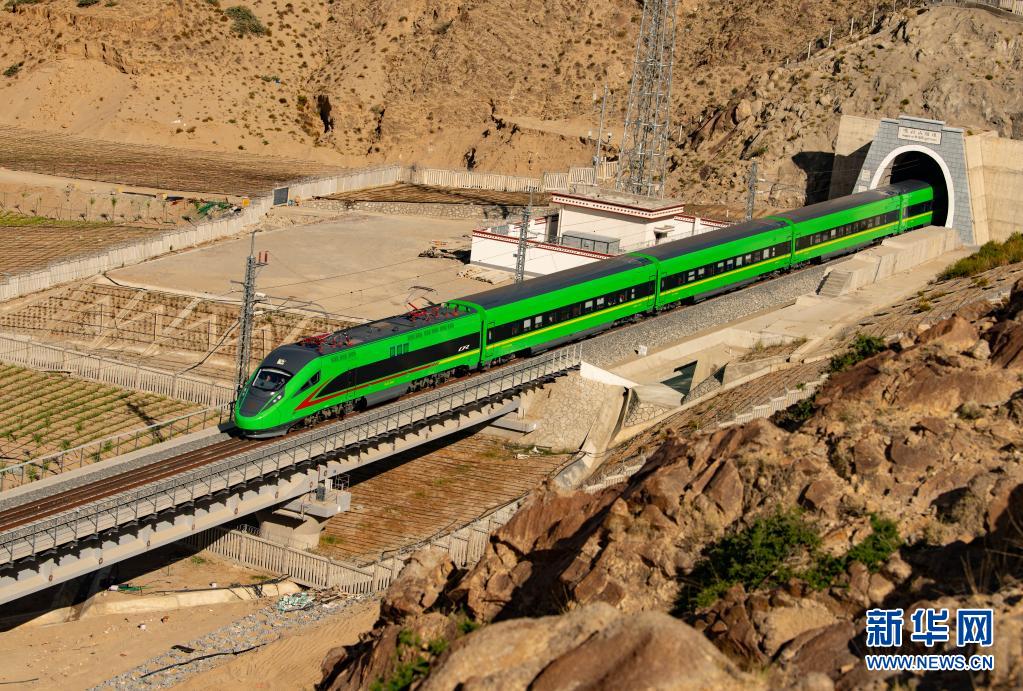 試運行的復興號列車駛出拉林鐵路的嘎拉山隧道(6月16日攝)。