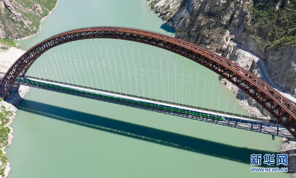 試運行的復(fù)興號列車行駛在藏木特大橋上(6月17日攝,無人機照片)。