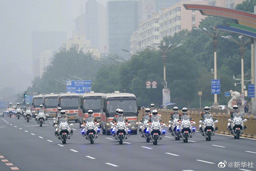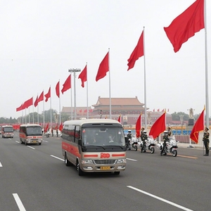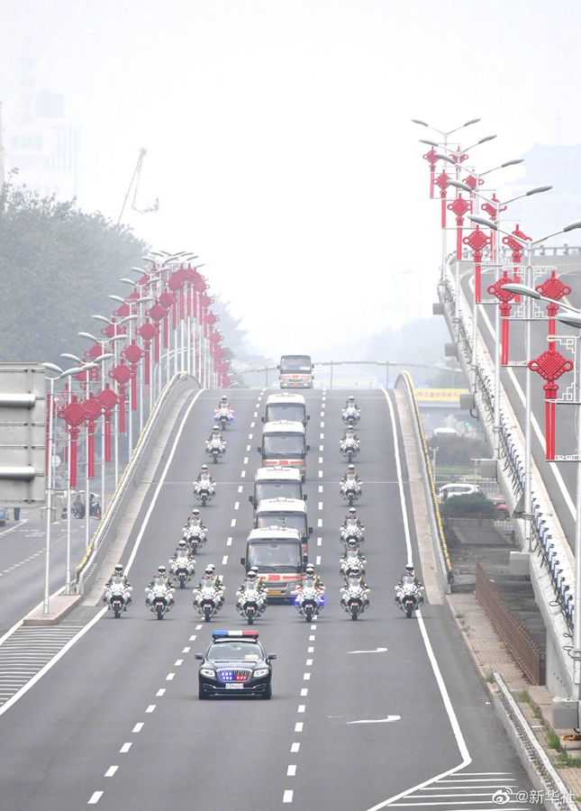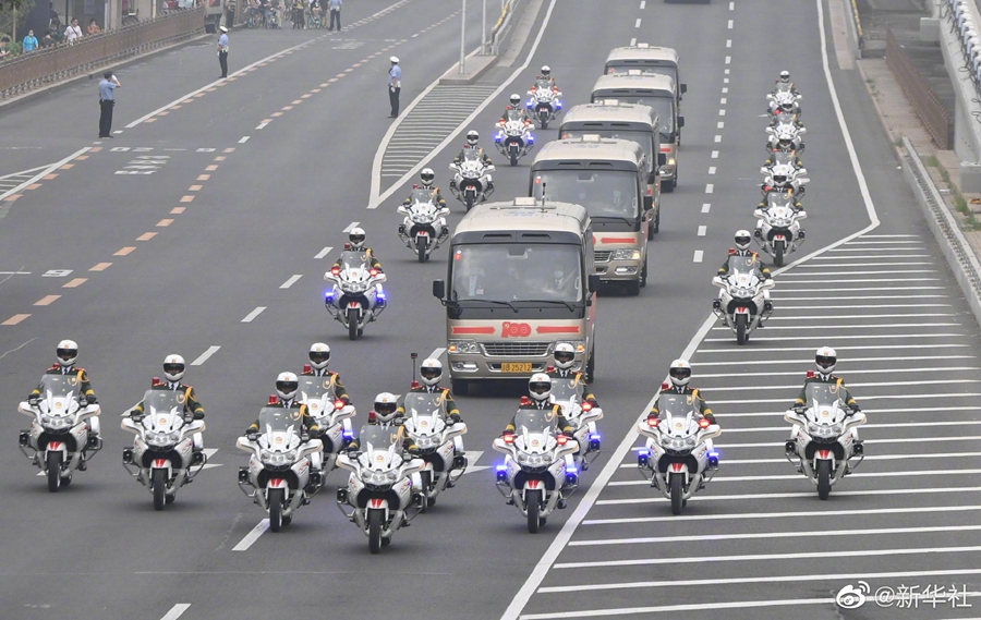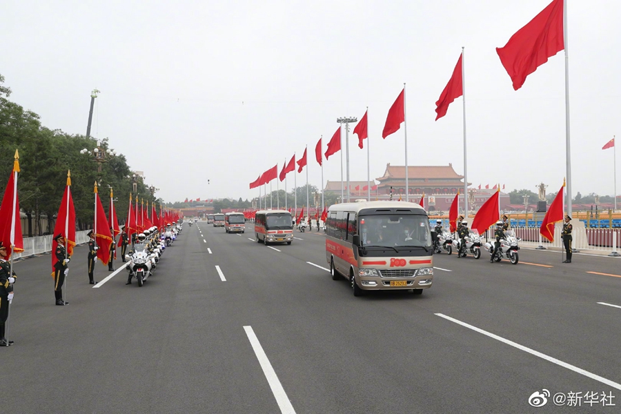 29日上午,“七一勛章”獲得者集體乘坐禮賓車從住地出發,由國賓護衛隊護衛前往人民大會堂。