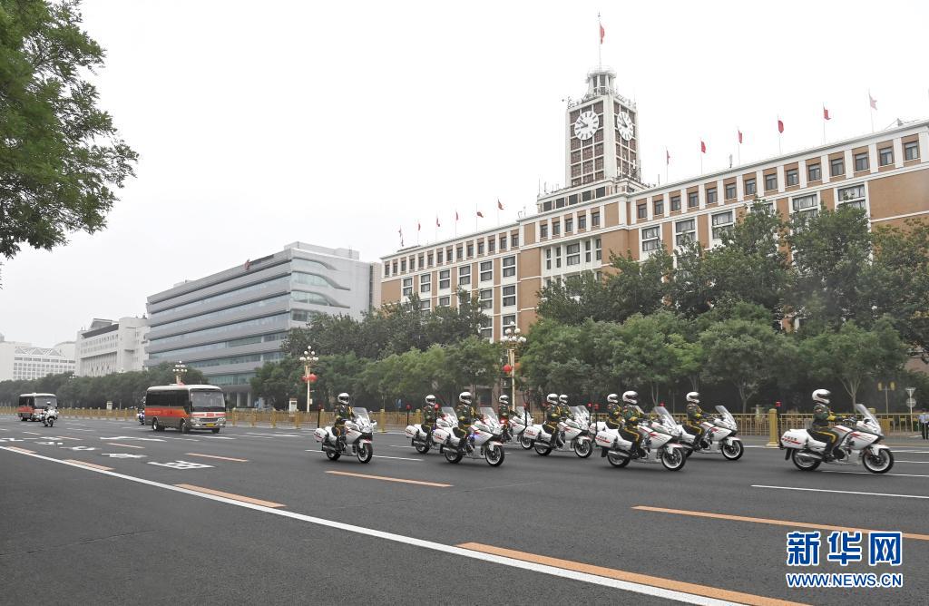 這是“七一勛章”獲得者集體乘坐禮賓車從住地出發,由國賓護衛隊護衛前往人民大會堂。
