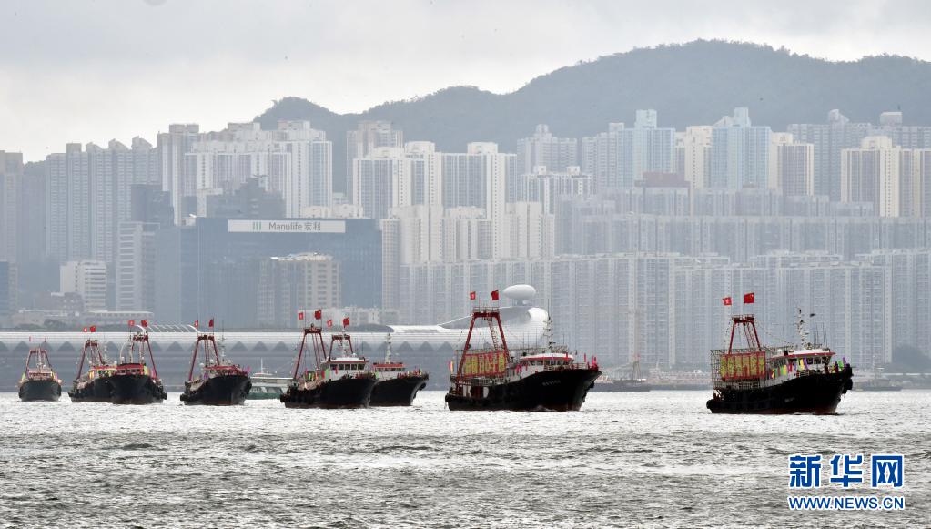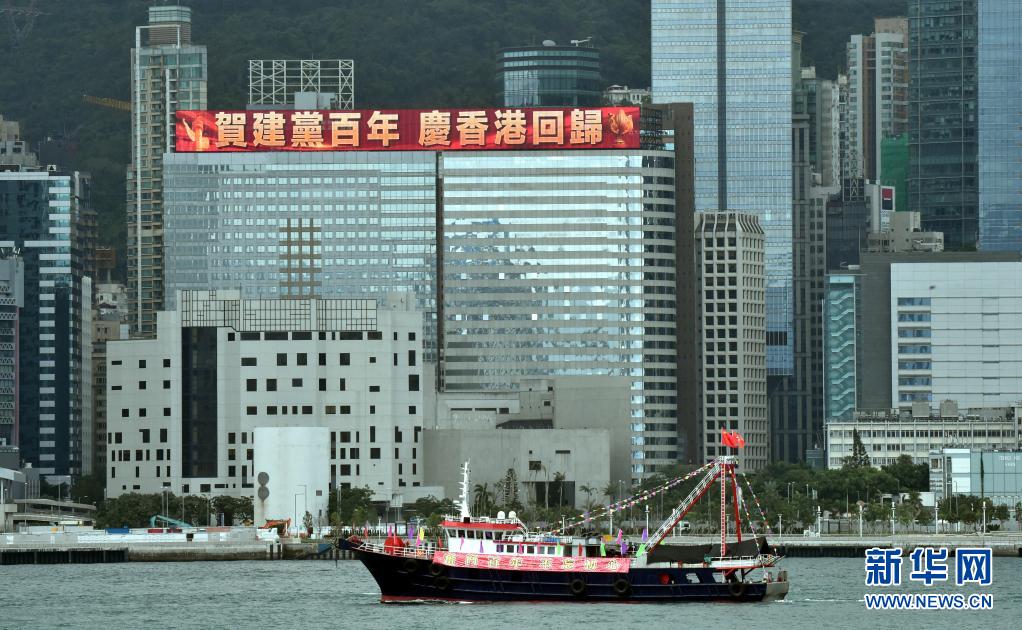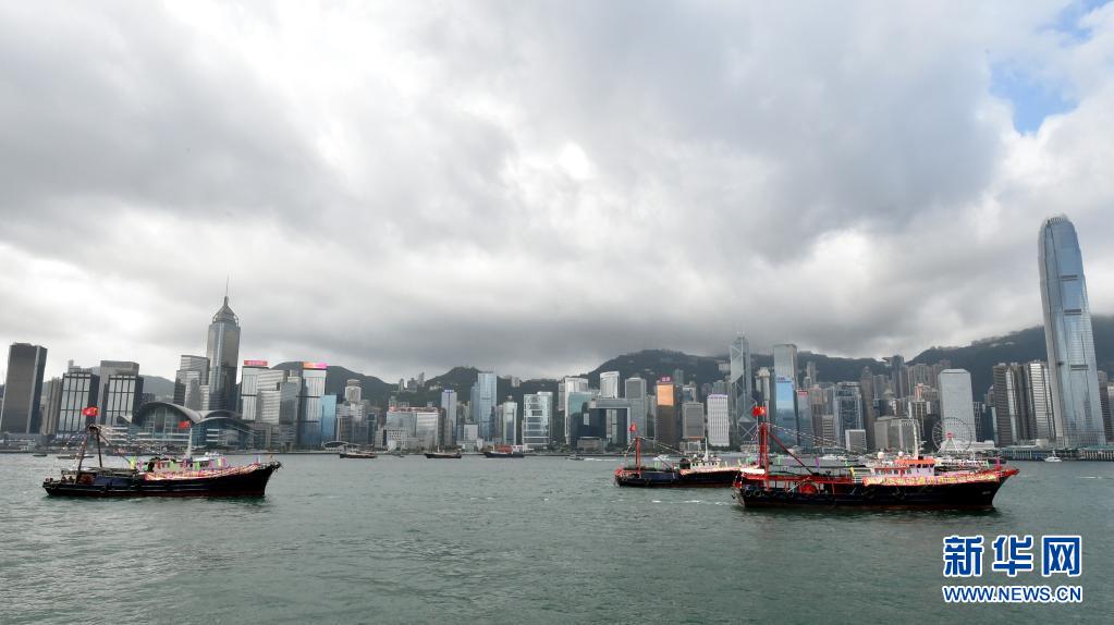 7月1日,懸掛國(guó)旗、區(qū)旗的漁船在維港巡游。新華社記者 盧炳輝 攝