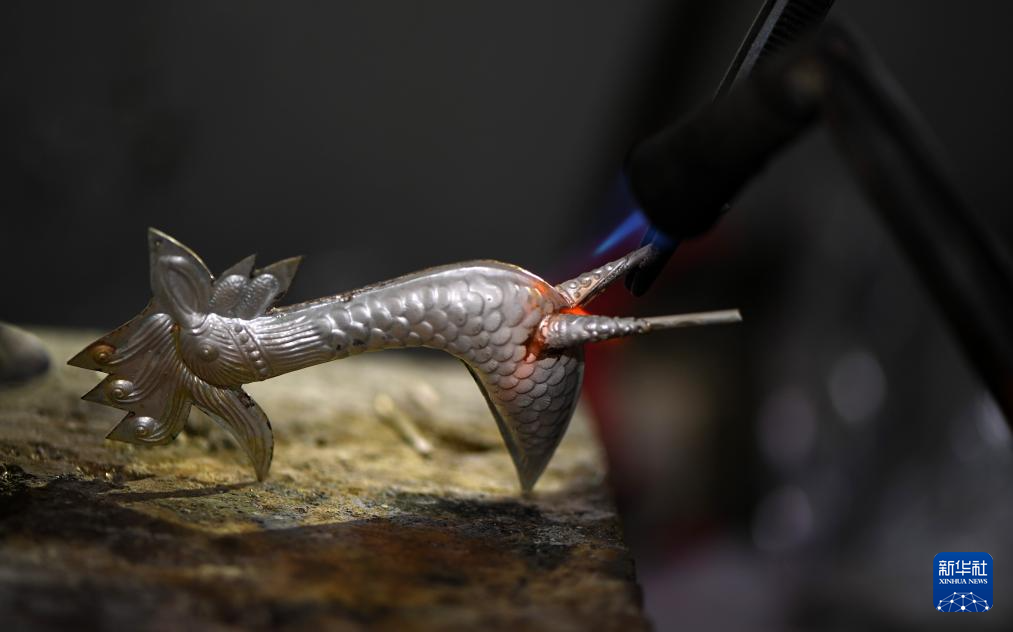 4月8日,手艺人在贵州省黄平县谷陇镇一家银饰店内制作银饰。
