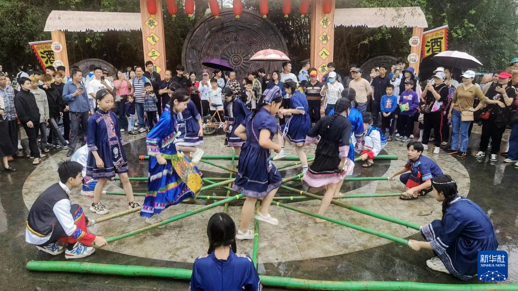 4月11日,广西钦州市钦北区贵台镇洞利村群众在跳竹竿舞,庆祝“三月三”传统佳节(无人机照片)。