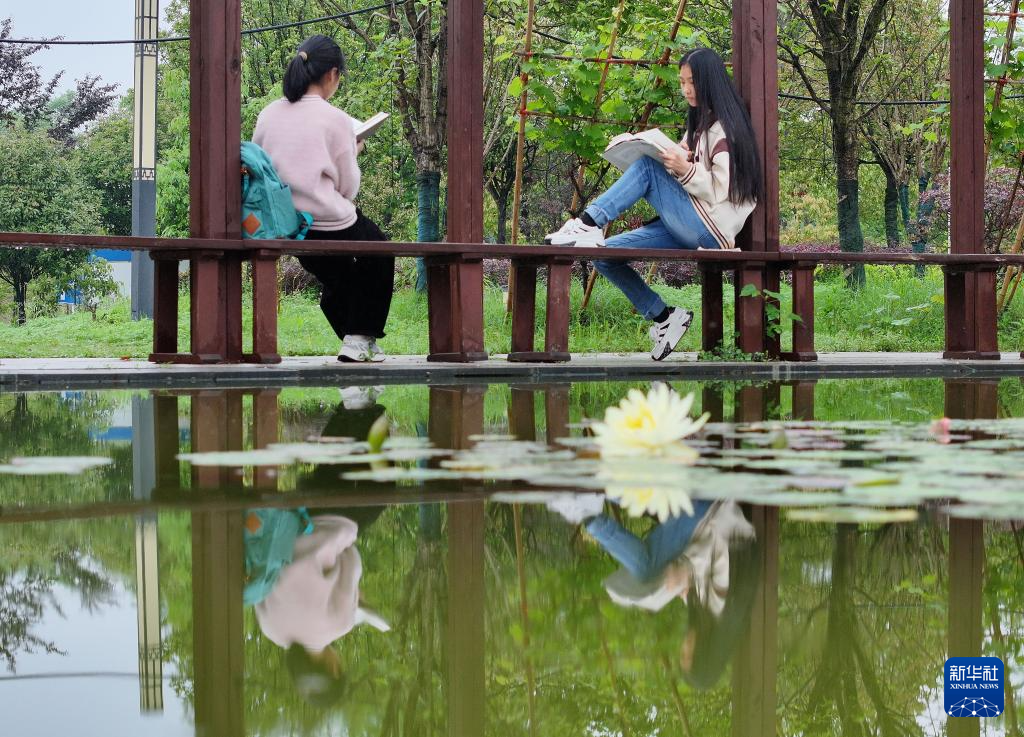 4月21日,两名学生在南华大学校园内读书。