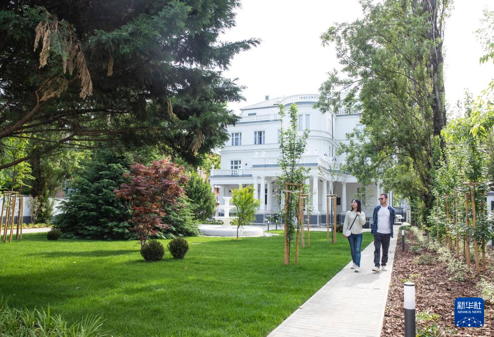 5月6日,人们走在匈牙利布达佩斯中国文化中心的花园内。