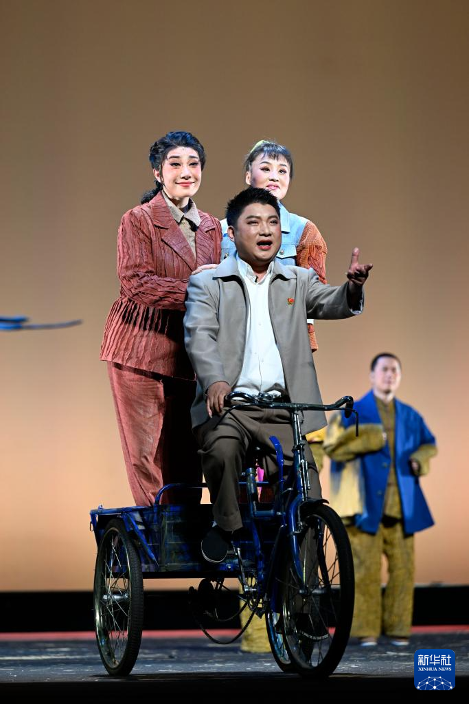 5月15日晚,在宁夏人民剧院,饰演李水河的侯艳(右)与饰演马阳阳的吴冰(左)在《攒劲女人》中表演。