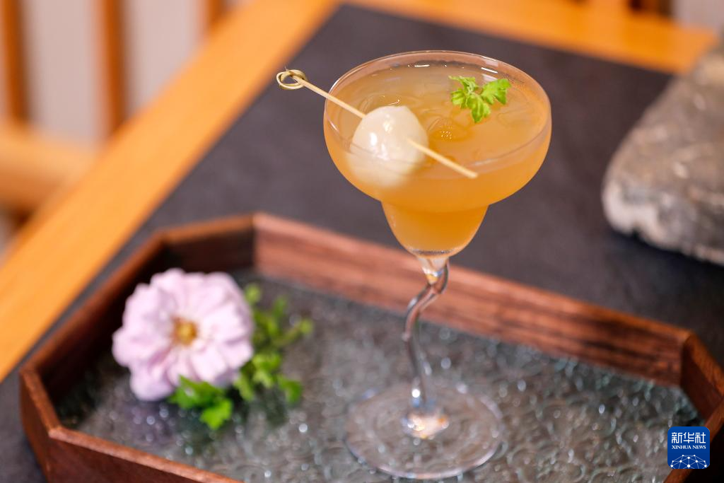 这是5月23日在黄山市屯溪区德茗舍茶艺职业培训学校拍摄的新中式调饮——啖红尘。