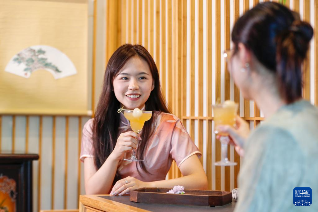 5月23日,在黄山市屯溪区一处茶空间,顾客品尝新式茶饮。