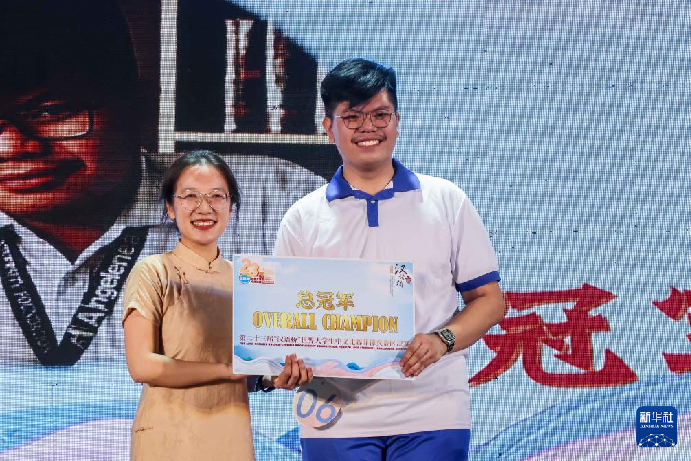 5月28日,来自菲律宾红溪礼示大学的选手马舒楠(右)在安赫莱斯市举行的“汉语桥”菲律宾赛区决赛上登台领奖。他在本次比赛中获得冠军。