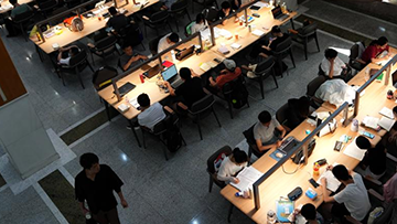 8月12日,在山东省青岛恒星科技学院,中俄学生交流剪纸创作。
