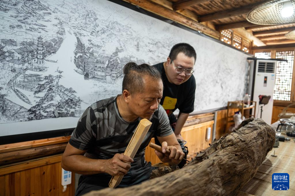 9月3日,在常德河街,潘氏艺术木雕非遗传承人潘能辉(左)向游客展示木雕技艺。