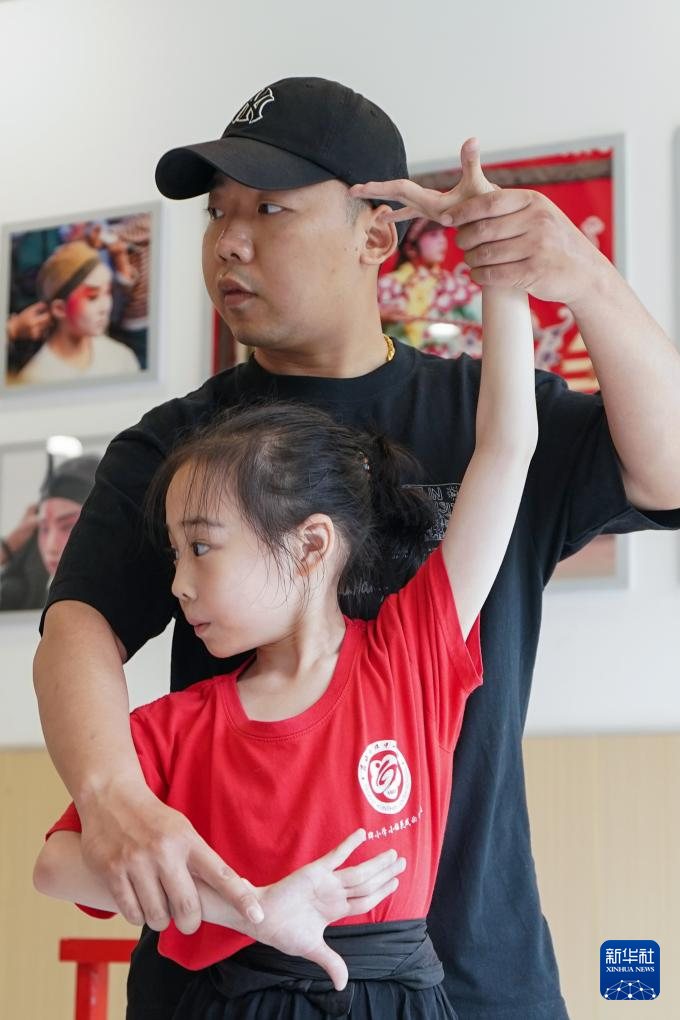 小昆班专职老师周杰(上)在指导解苏倩(下)进行昆曲剧目专项表演训练(5月26日摄)。