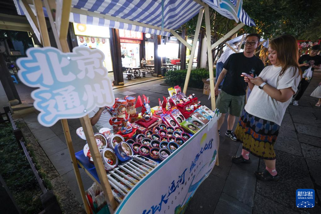 9月13日,在大运河奇妙夜中秋市集上展示的非遗产品。中秋市集上有北京“兔爷儿”、临清贡砖、洛阳大袖衫、苏州宋锦、宁波金银彩绣等大运河沿线的非物质文化遗产展示。