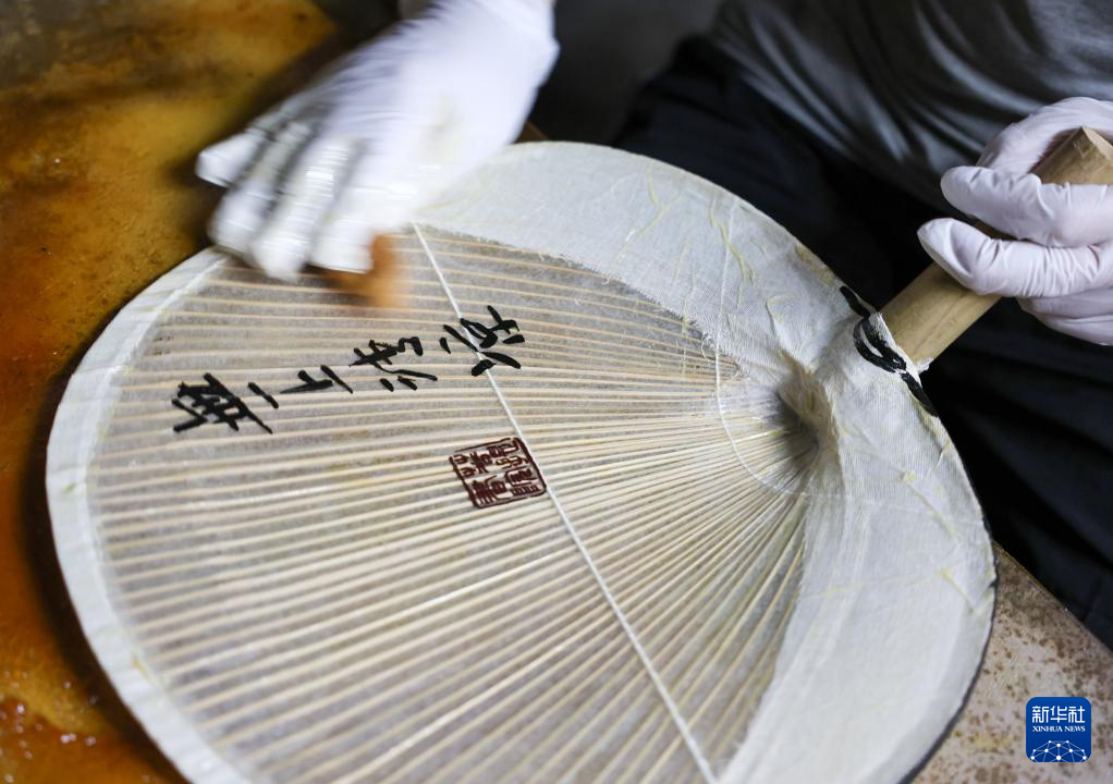在宁德福安市官埔村,一家官埔油扇作坊的工人在给油扇扇面刷桐油(2024年6月25日摄)。