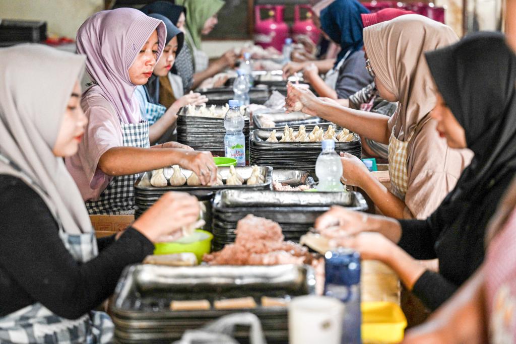 1月14日,在印度尼西亚南唐格朗,工人在一家点心作坊制作点心。