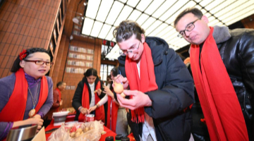 2月3日,游客在山东省乐陵市影视城观看舞龙表演。