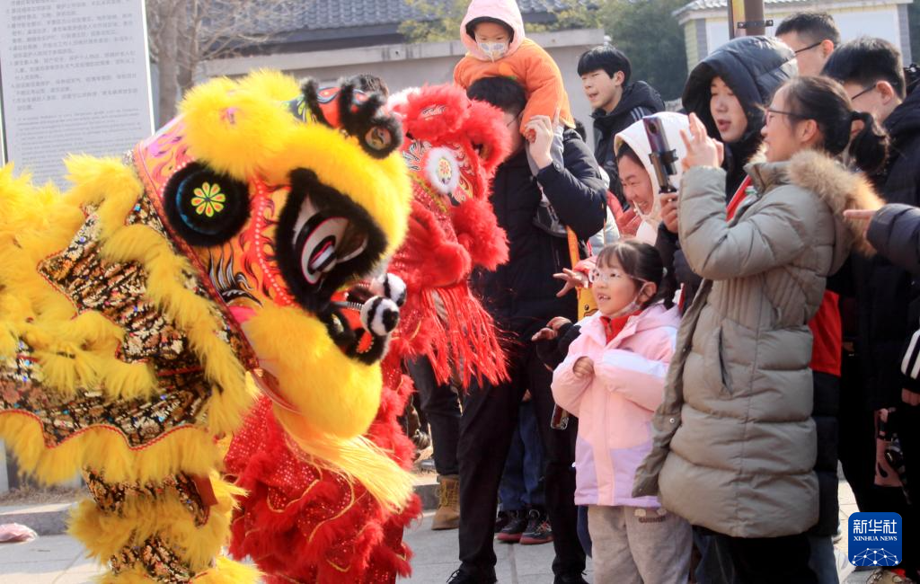 1月29日,游客在山东省临沂市郯城县郯国古城景区观看舞狮表演。