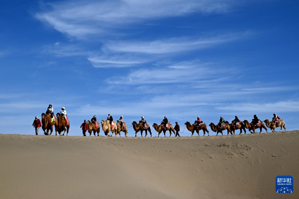 2025年2月4日,游客在敦煌鸣沙山月牙泉景区骑骆驼游览。