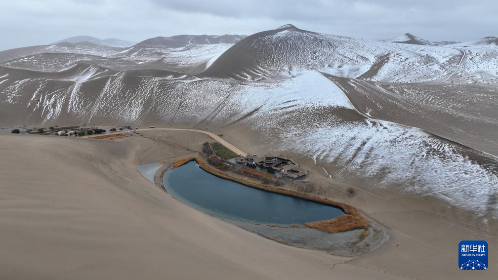 这是2014年11月23日拍摄的敦煌市鸣沙山月牙泉景区雪景(无人机照片)。