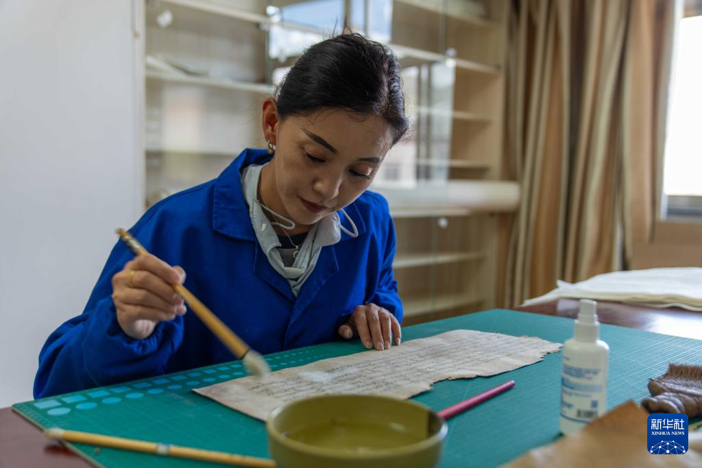 8月13日,西藏自治区古籍保护中心古籍修复员次仁央宗在对古籍进行除霉。
