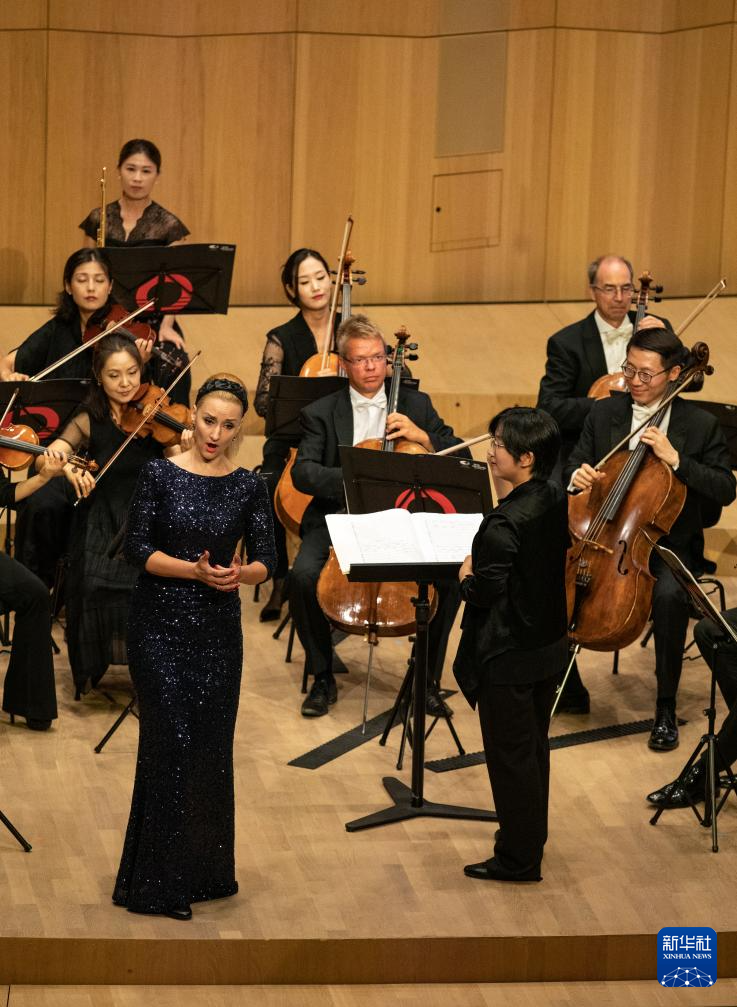 8月13日,在德国法兰克福克伦贝格音乐学院卡萨尔斯音乐厅,女高音歌唱家威廉明娜·特劳布(前左)演唱中国民歌《茉莉花》。