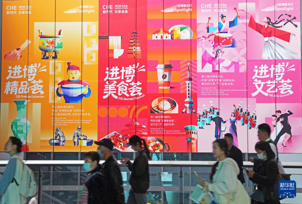 11月8日,在国家会展中心(上海),观众走过“进博精品荟”“进博美食荟”“进博文艺荟”的巨幅海报。