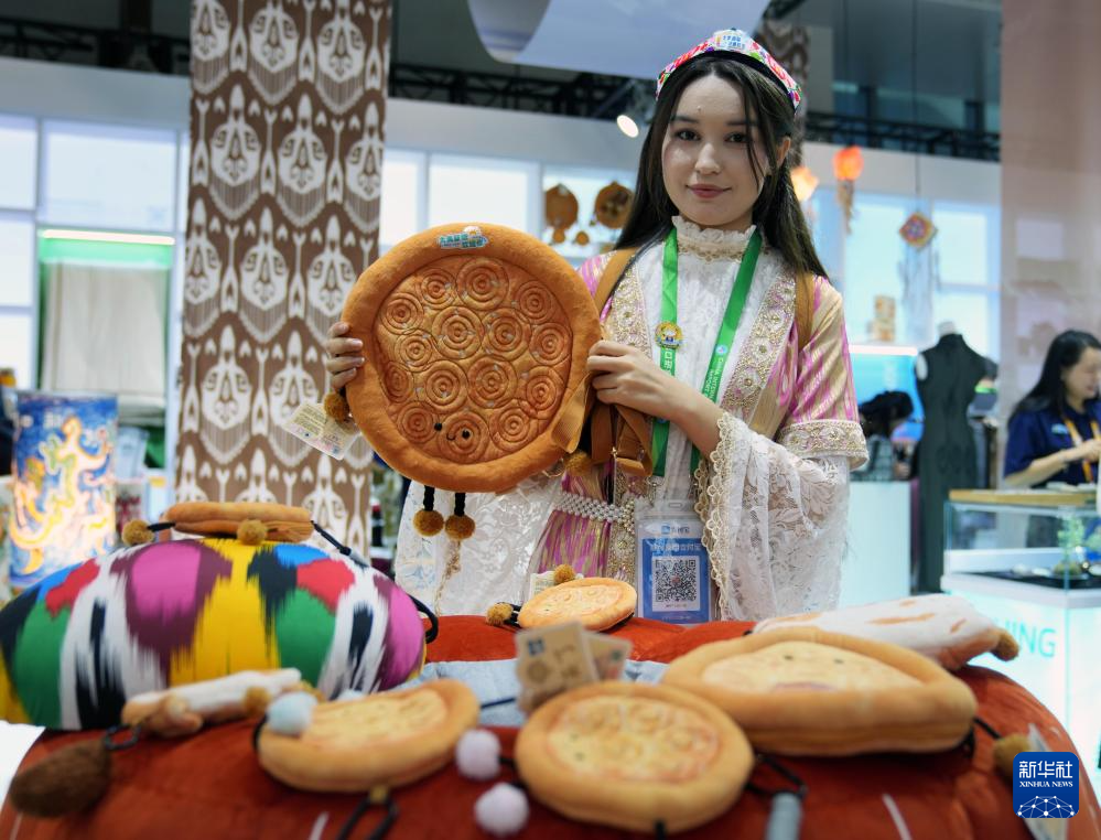 11月8日,工作人员在第八届进博会新疆馆展示馕文创产品。