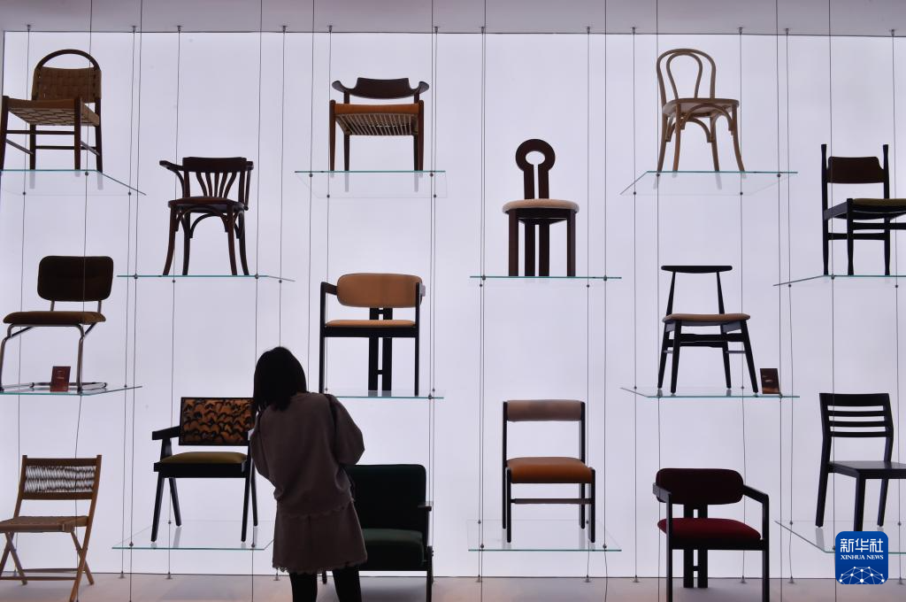 11月6日,观众在第八届进博会江西赣州展厅参观展出的各式椅子。