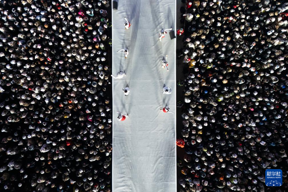 12月17日,游客在哈尔滨冰雪大世界园区体验“超级冰滑梯”(无人机照片)。