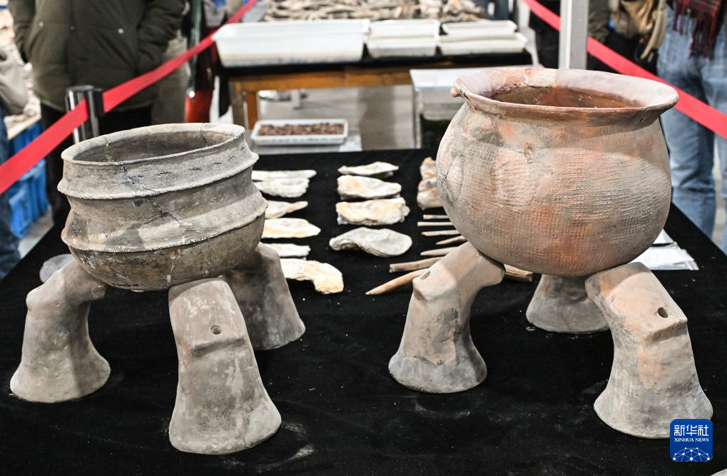 这是井头山遗址出土的带有支脚的陶釜(右)(12月15日摄)。