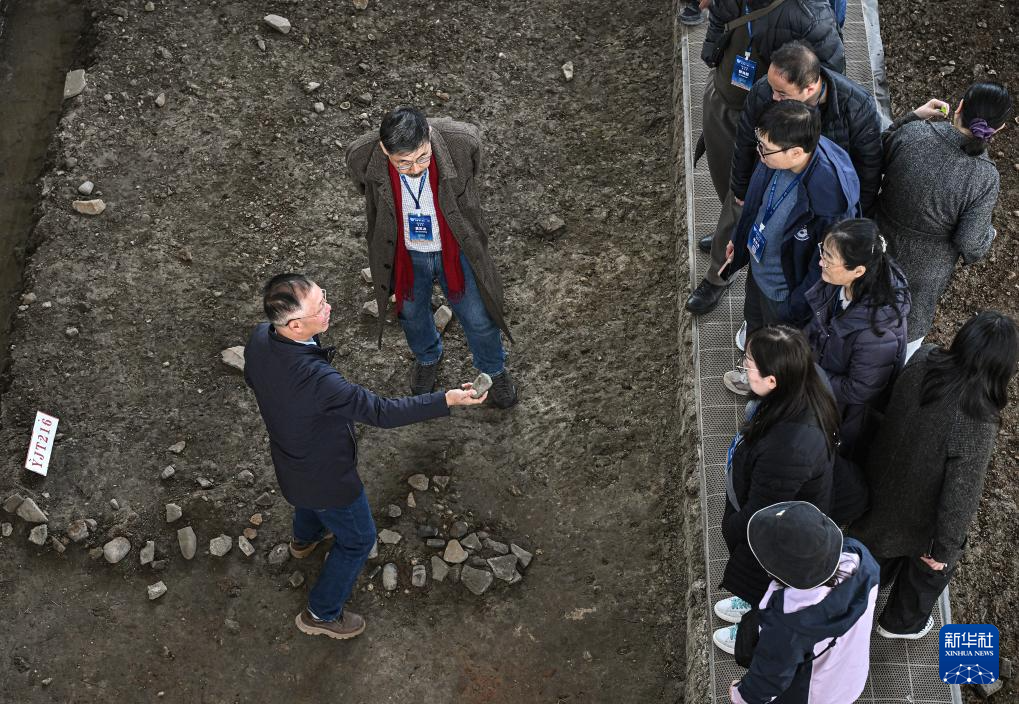 井头山遗址考古领队孙国平(左一)在遗址第二期发掘基坑内向前来参观考察的专家学者介绍集中出土的成组石器(12月15日摄)。