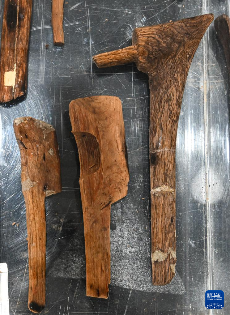 这是井头山遗址出土的用于安装石斧、石锛的木柄(12月15日摄)。