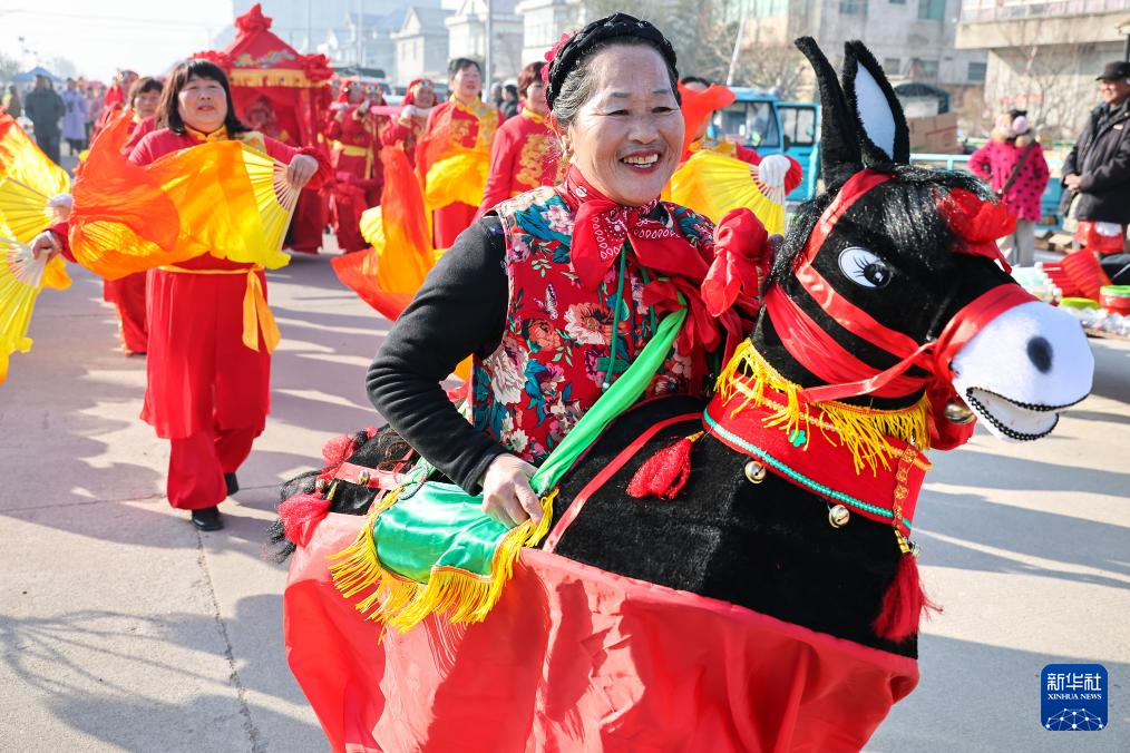 2月2日,在江苏省连云港市赣榆区墩尚镇乡村大集上,民间艺人进行赶毛驴表演。