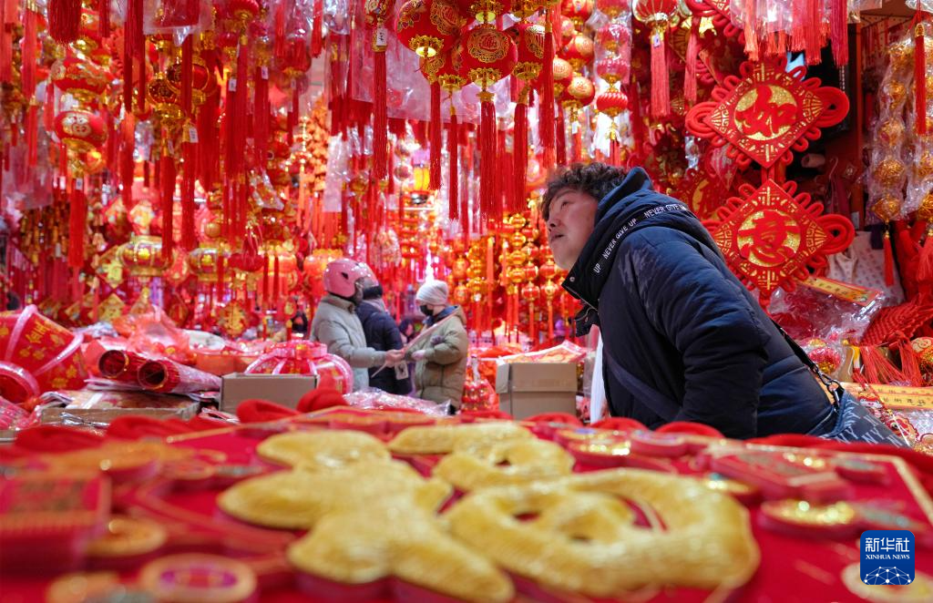 2月3日,市民在河南省开封市鼓楼区一年货市场选购春节饰品。