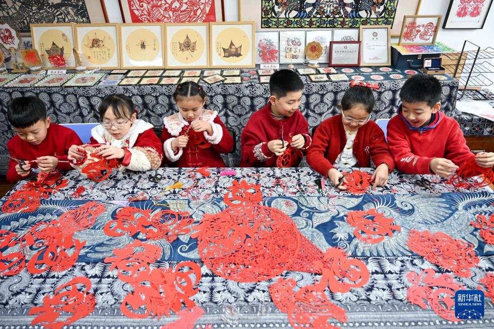 2月2日,在江苏省兴化市昭阳街道的毕飞宇工作室内,兴化市昭阳湖幼儿园的孩子们在老师的指导下创作以生肖马为主题的剪纸。