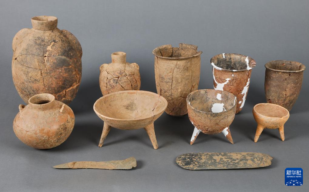 河南新郑市裴李岗石器时代遗址西部墓葬区M85出土的器物组合(资料照片)。