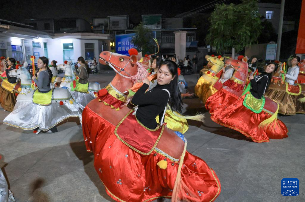 新春将至,广东省潮州市饶平县处处洋溢着喜庆的节日氛围,当地居民正紧锣密鼓地排练独具特色的布马舞,为春节期间的庆典活动做准备。