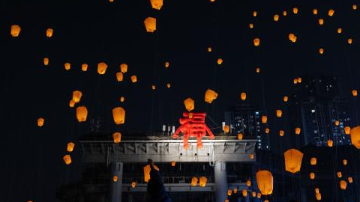 2月11日,市民和游客在湖北省恩施土家族苗族自治州宣恩县贡水河畔赏灯游玩(无人机照片)。
