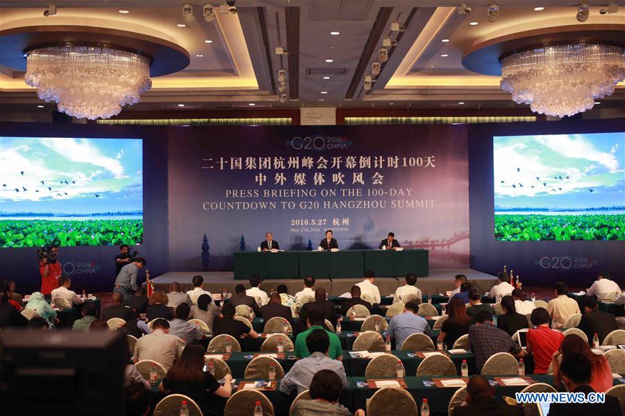 HANGZHOU, May 27, 2016 (Xinhua) -- A press briefing on the 100-day countdown to G20 Hangzhou Summit is held in Hangzhou, capital of east China's Zhejiang Province, May 27, 2016. (Xinhua/Xing Guangli)