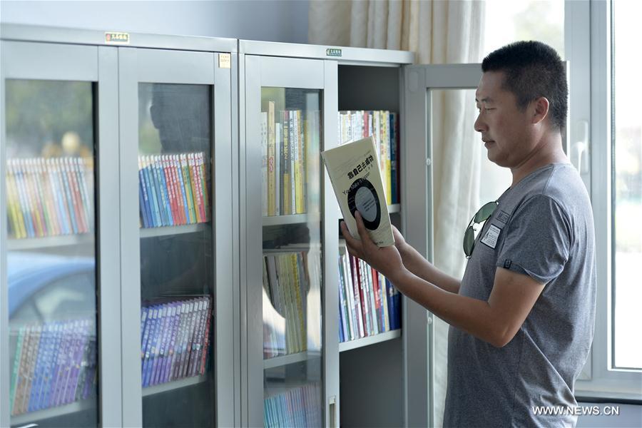 A drivers reads a book at a book house at the highway toll gate in Xingtai City, north China's Hebei Province, Aug. 15, 2017. A free book house was established in the toll gate on Tuesday to offer drivers a place to have a rest. (Xinhua/Chen Lei)