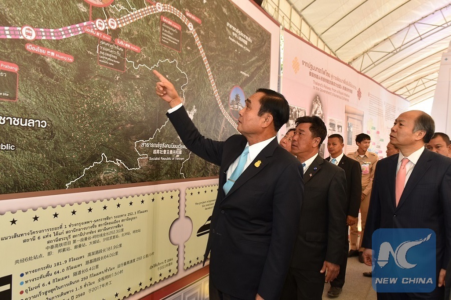Thai Prime Minister Prayut Chan-o-cha watches a diagram at a ground-breaking ceremony for the first phase of the China-Thailand high-speed railway, on Dec. 21, Pak Chong, Nakhon Ratchasima province, Thailand. (Xinhua/Li Mangmang)
