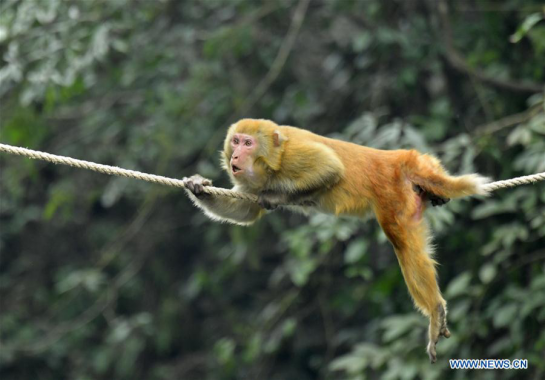 A wild macaque climbs on a rope over a river to seek food in Shiziguan Village, Xuan'en County, central China's Hubei Province, Dec. 27, 2017. Each winter, wild macaques would approach human habitat to seek food. (Xinhua/Song Wen)
