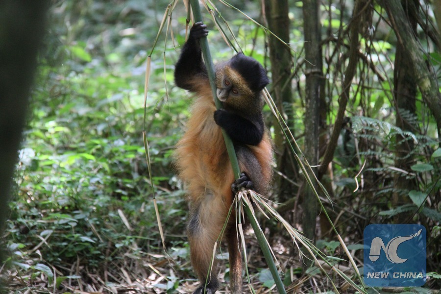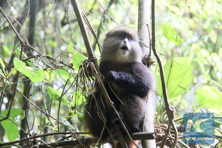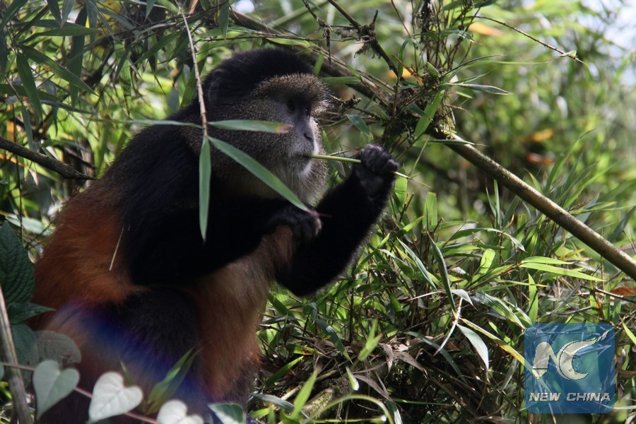 A golden monkey stays in the forest in Volcanoes National Park, northwestern Rwanda, on Dec. 25, 2017. (Xinhua/Lyu Tianran)